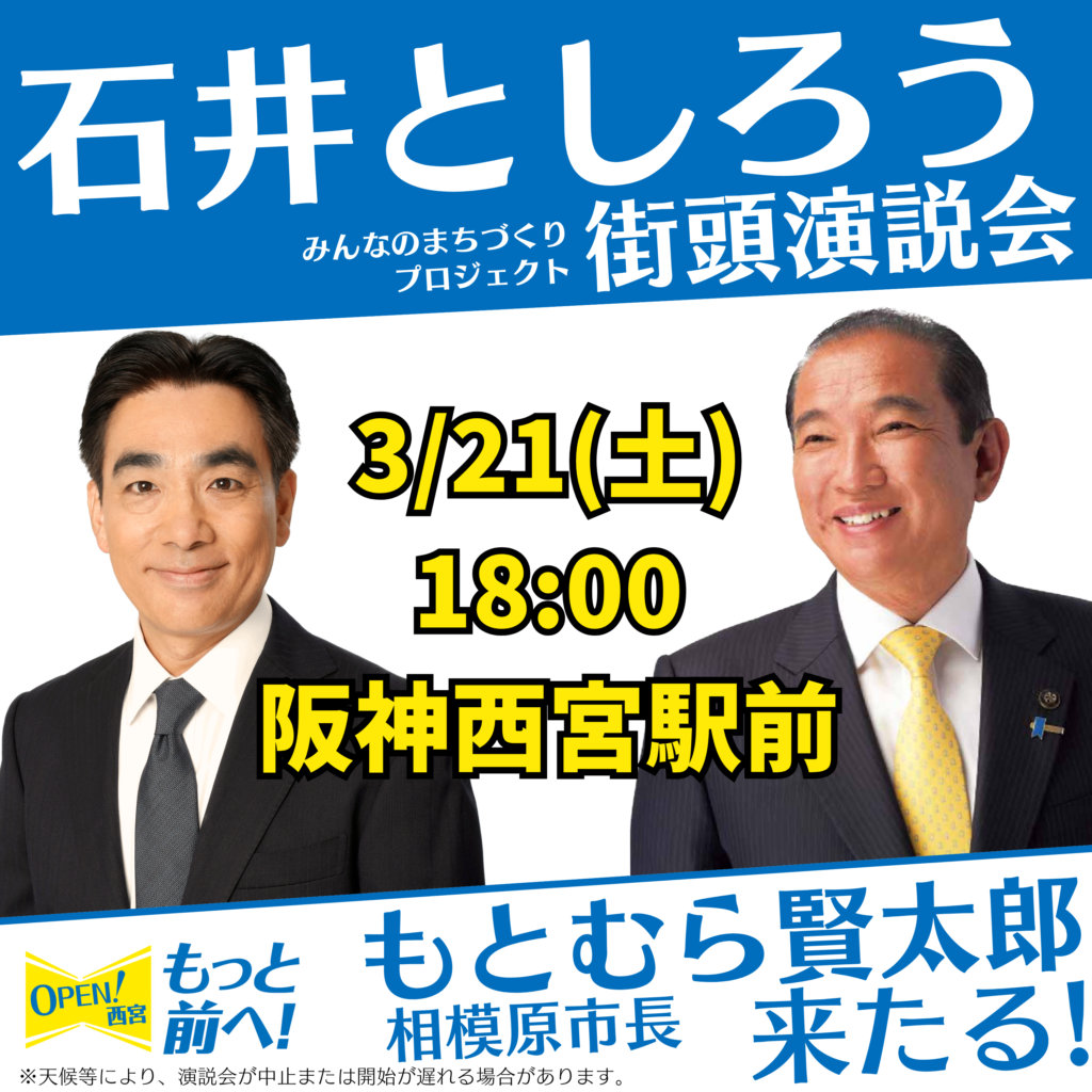 - 3月21日(土)18:00 阪神西宮駅前 with 本村賢太郎 相模原市長